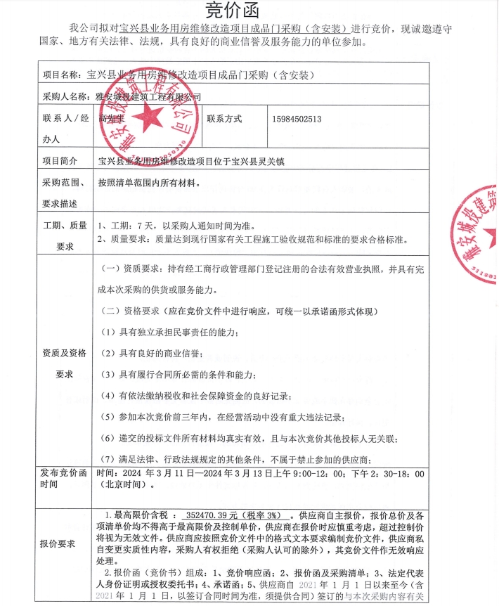 寶興縣業(yè)務(wù)用房維修改造項(xiàng)目成品門(mén)采購(gòu)(含安裝)競(jìng)價(jià)公告