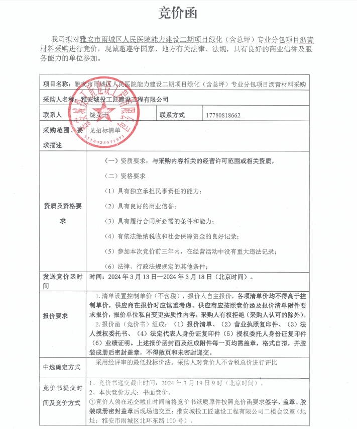 雅安市雨城區(qū)人民醫(yī)院能力建設(shè)二期項目綠化(含總坪)專業(yè)分包項目瀝青材料采購競價公告