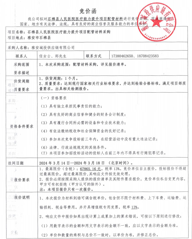 石棉縣人民醫(yī)院醫(yī)療能力提升項(xiàng)目配管材料競(jìng)價(jià)公告