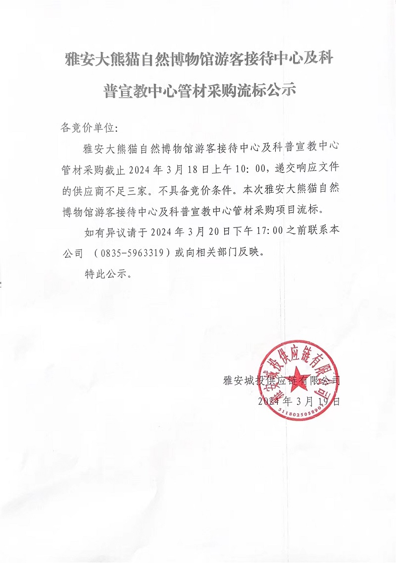 雅安大熊貓自然博物館游客接待中心及科普宣教中心管材采購流標公示
