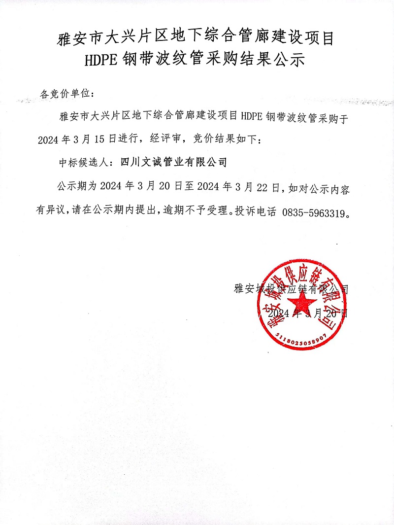 雅安市大興片區(qū)地下綜合管廊建設項目HDPE鋼帶波紋管采購結(jié)果公示