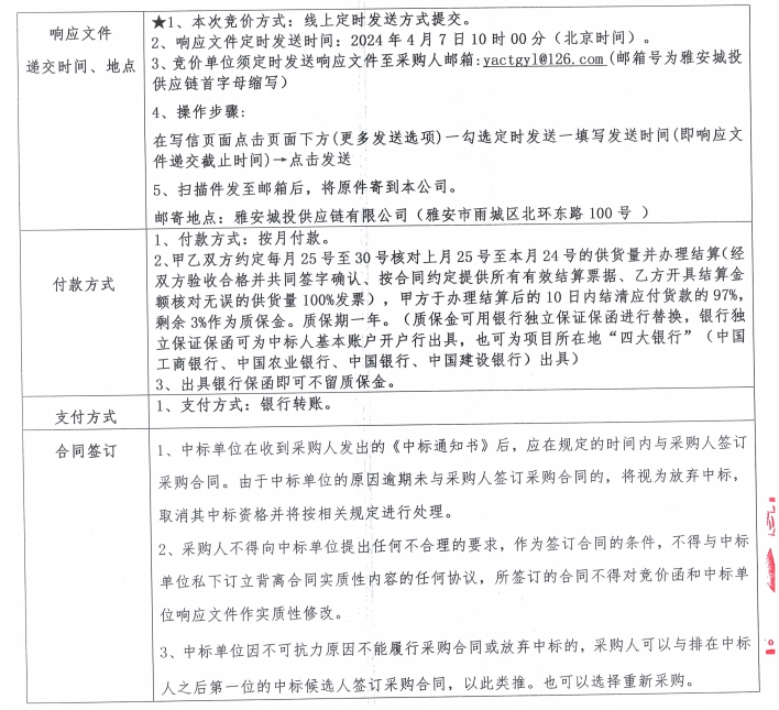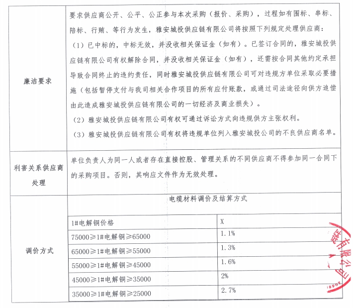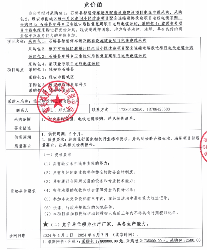 雅安城投供應(yīng)鏈有限公司電線電纜采購競(jìng)價(jià)公告