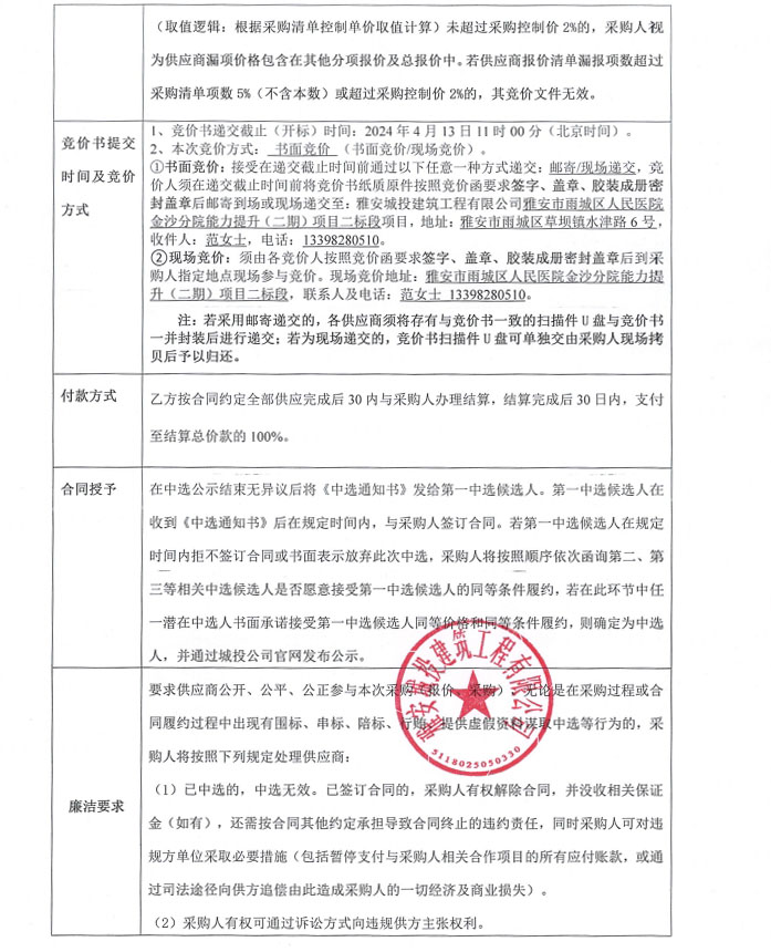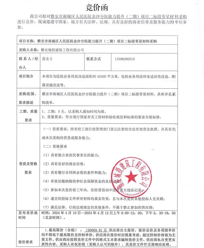 雅安市雨城區(qū)人民醫(yī)院金沙分院能力提升(二期)項目二標段零星材料采購競價公告