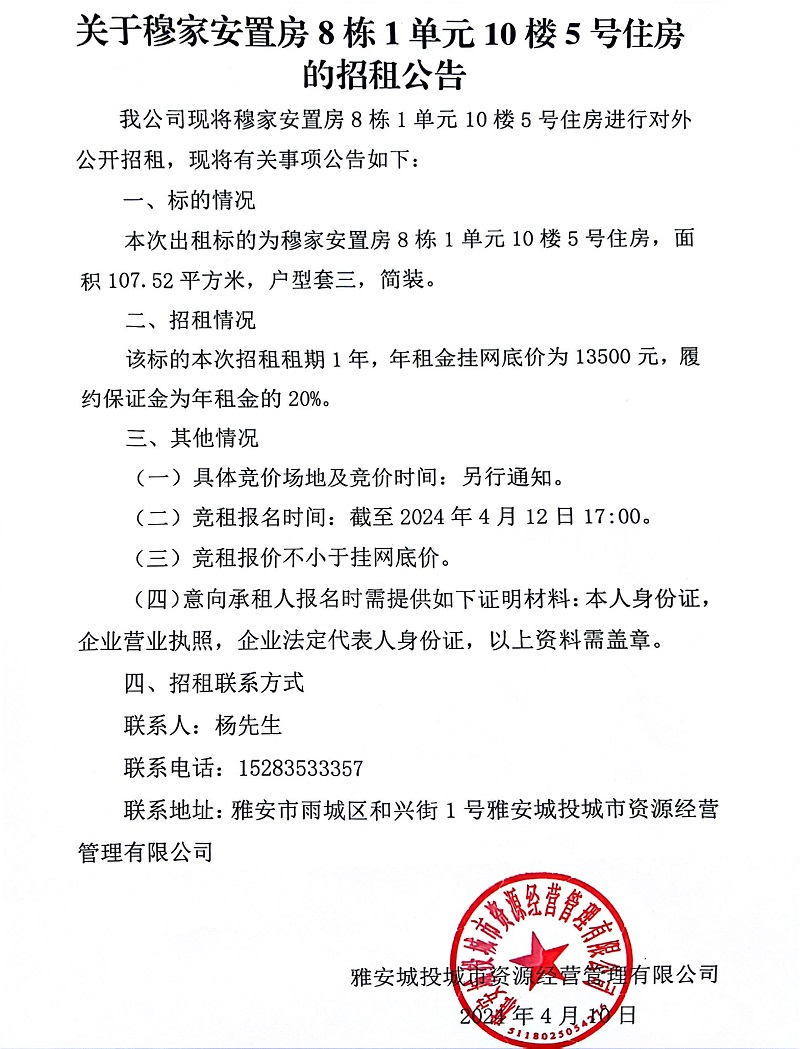 關(guān)于穆家安置房8棟1單元10樓5號(hào)住房的招租公告