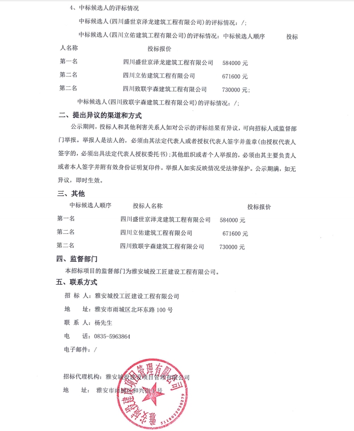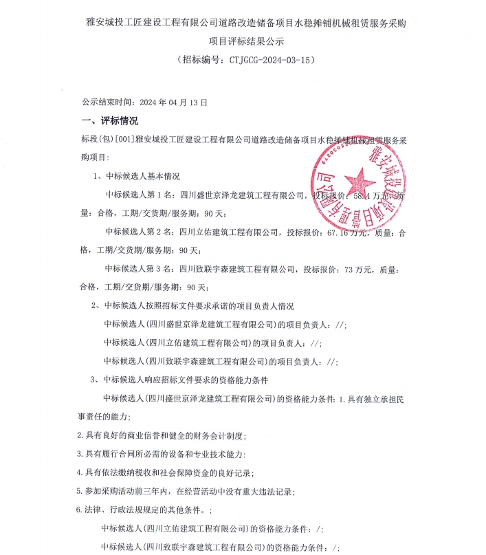 雅安城投工匠建設工程有限公司道路改造儲備項目水穩(wěn)攤鋪機械租賃服務采購項目評標結果公示