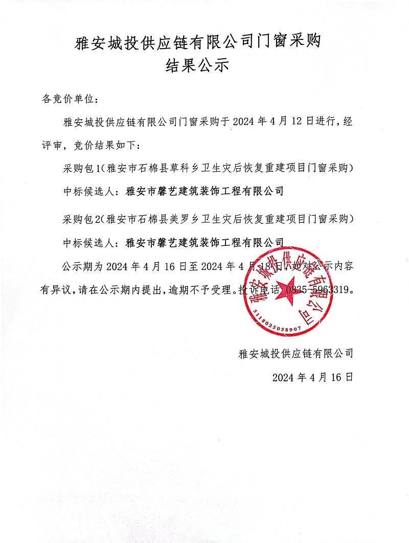 雅安城投供應(yīng)鏈有限公司門窗采購結(jié)果公示