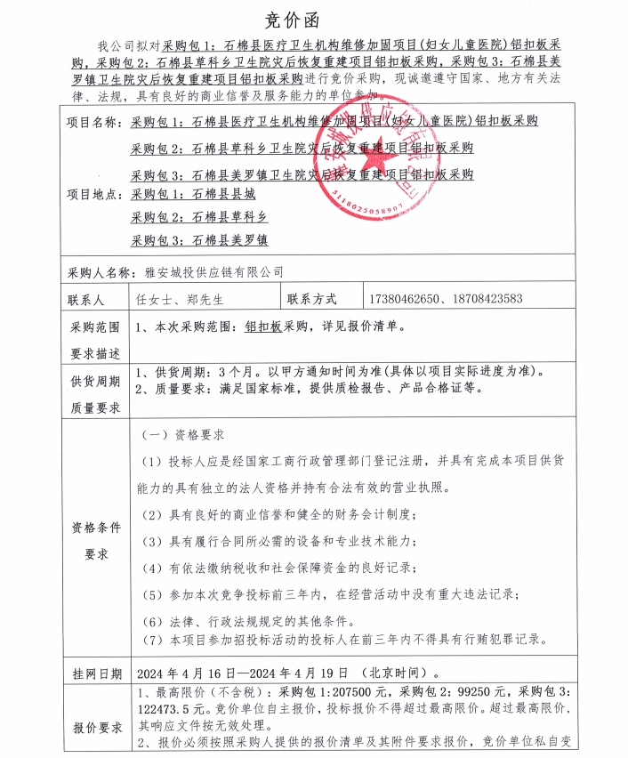 雅安城投供應(yīng)鏈有限公司鋁扣板采購(gòu)競(jìng)價(jià)公告