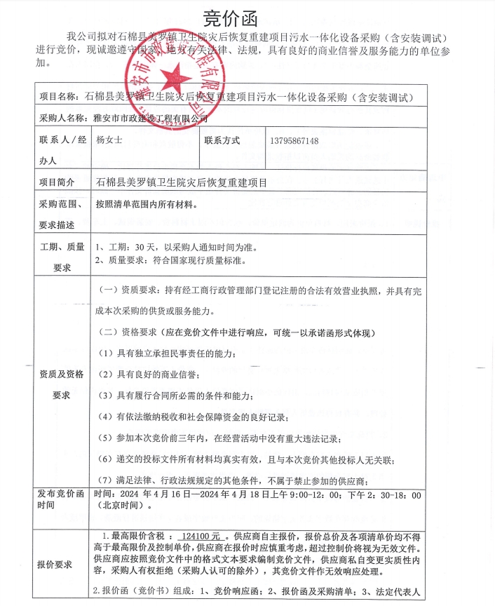 石棉縣美羅鎮(zhèn)衛(wèi)生院災后恢復重建項目污水一體化設(shè)備材料采購(含安裝調(diào)試)競價公告