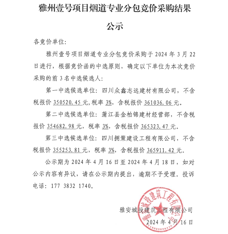 雅州壹號(hào)項(xiàng)目煙道專(zhuān)業(yè)分包競(jìng)價(jià)采購(gòu)結(jié)果公示