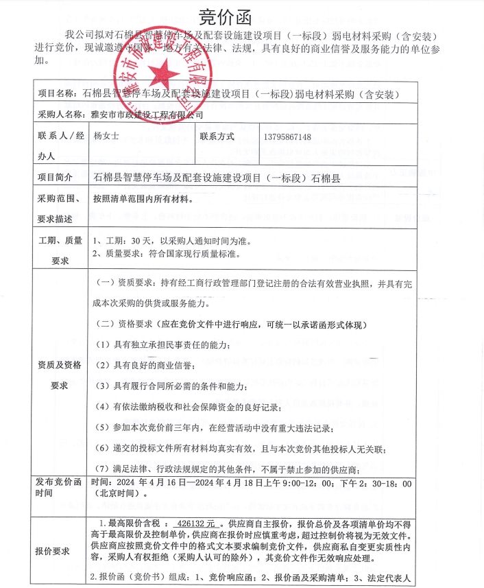 石棉縣智慧停車場及配套設(shè)施建設(shè)項目(一標(biāo)段)弱電材料采購(含安裝)競價公告