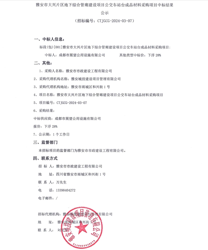 雅安市大興片區(qū)地下綜合管廊建設項目公交車站臺成品材料采購項目中標結(jié)果公示
