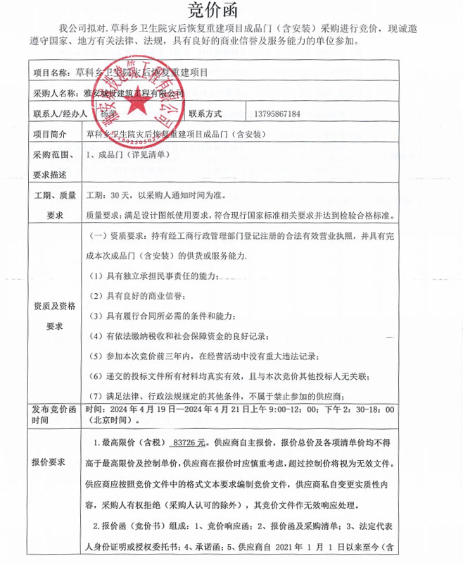 草科鄉(xiāng)衛(wèi)生院災(zāi)后恢復(fù)重建項目成品門(含安裝)采購競價公告