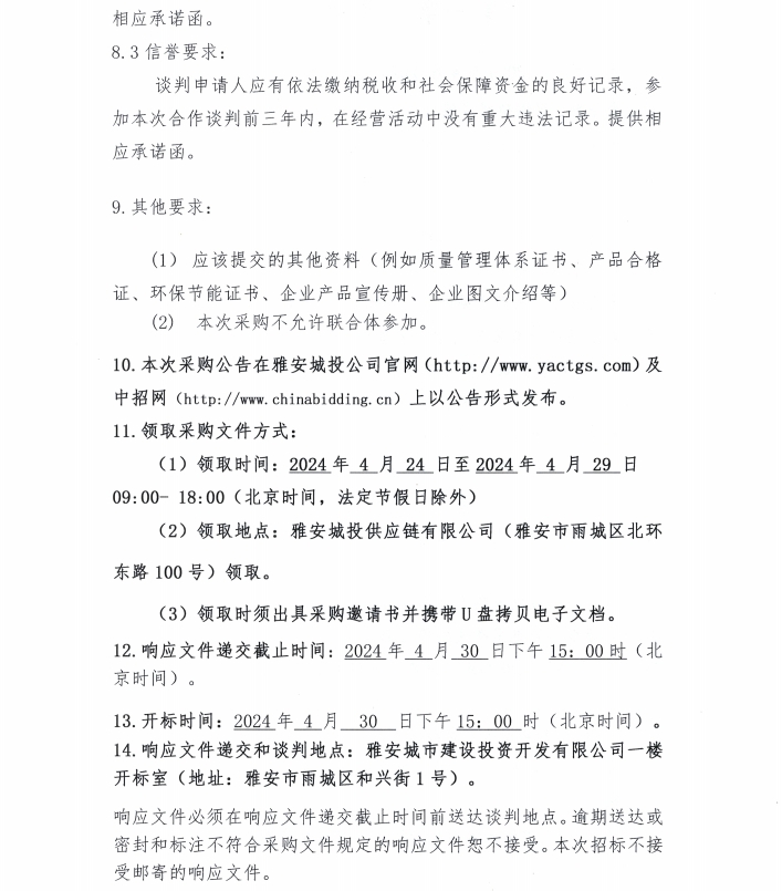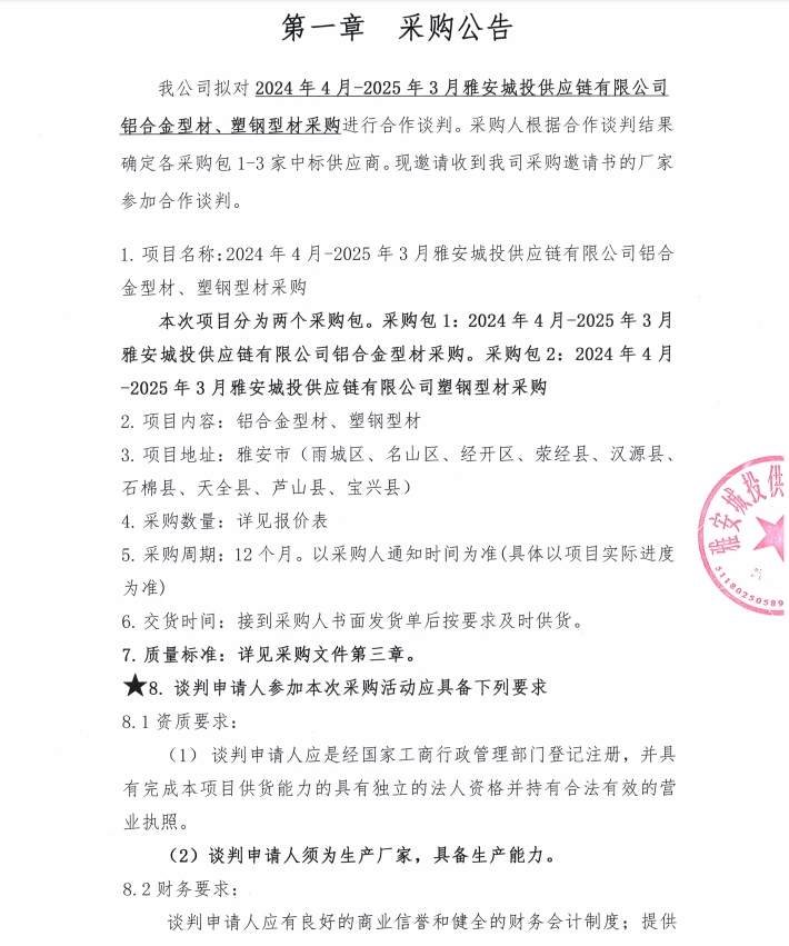 2024年4月-2025年3月雅安城投供應鏈有限公司鋁合金型材、塑鋼型材采購公告