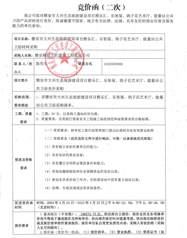 雅安市大興生態(tài)旅游建設(shè)項(xiàng)目雅樂(lè)匯、樂(lè)智屋、鴿子花藝術(shù)廳、能量站公共衛(wèi)浴材料采購(gòu)(第二次)競(jìng)價(jià)公告