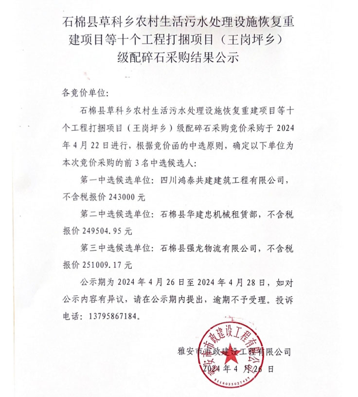 石棉縣草科鄉(xiāng)農(nóng)村生活污水處理設施恢復重建項目等十個工程打捆項目(王崗坪鄉(xiāng))級配碎石采購結果公示