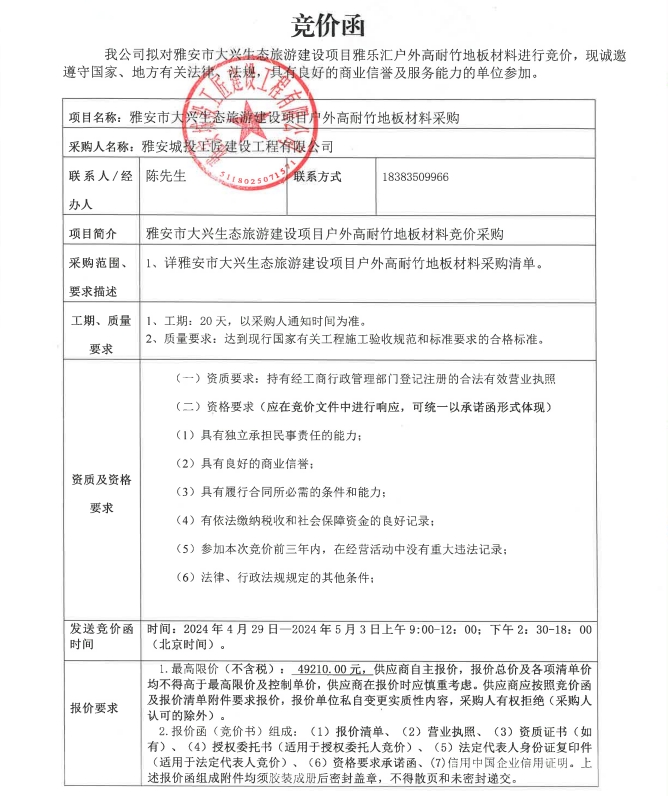 雅安市大興生態(tài)旅游建設(shè)項(xiàng)目霽雨橋、木棧道戶外高耐竹地板材料采購(gòu)競(jìng)價(jià)公告
