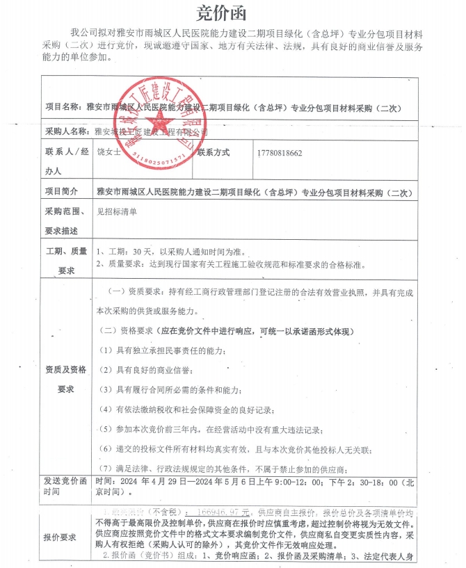 競價函-雅安市雨城區(qū)人民醫(yī)院能力建設(shè)二期項目綠化(含總坪)專業(yè)分包項目材料采購(二次)