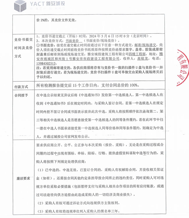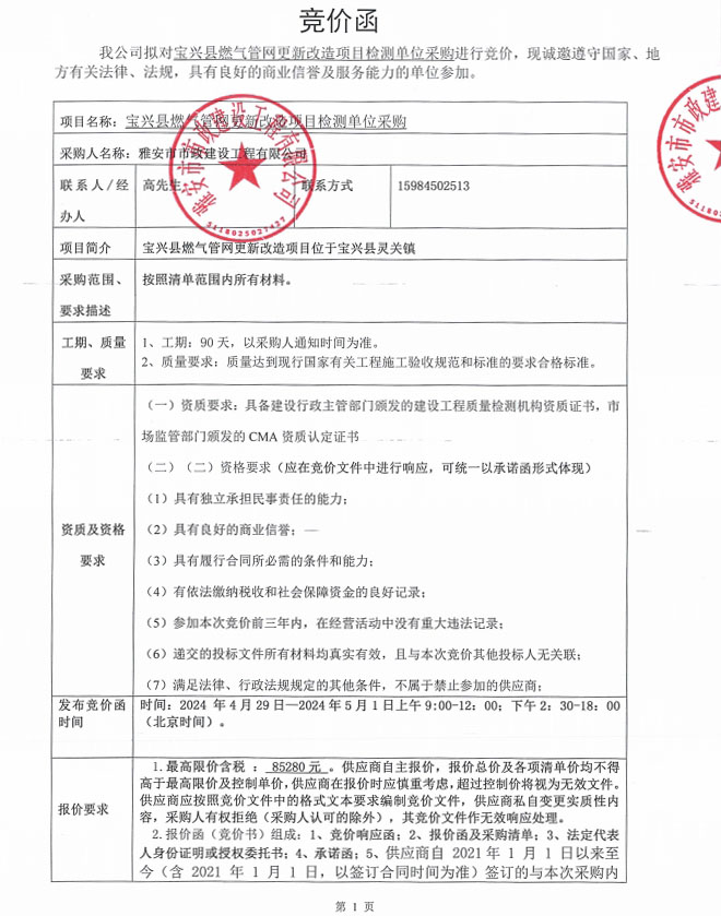 寶興縣燃?xì)夤芫W(wǎng)更新改造項(xiàng)目檢測單位采購競價公告