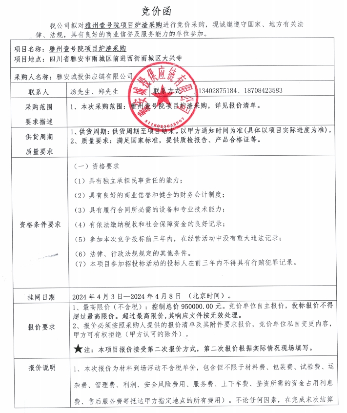 雅州壹號(hào)院項(xiàng)目爐渣采購競(jìng)價(jià)公告