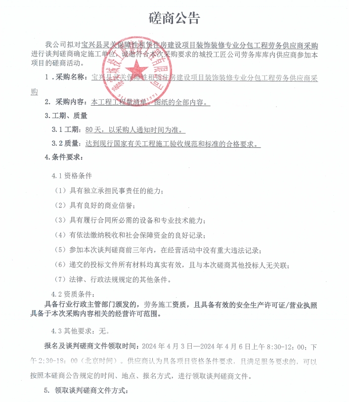 寶興縣靈關保障性租賃住房建設項目裝飾裝修專業(yè)分包工程勞務供應商采購磋商公告