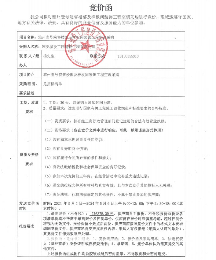 競(jìng)價(jià)函-空調(diào)采購(gòu)-雅州壹號(hào)院售樓部及樣板間