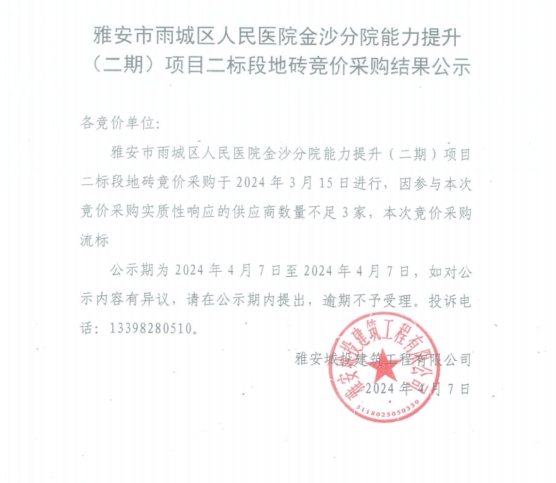 雅安市雨城區(qū)人民醫(yī)院金沙分院能力提升(二期)項目二標段地磚競價采購結果公示
