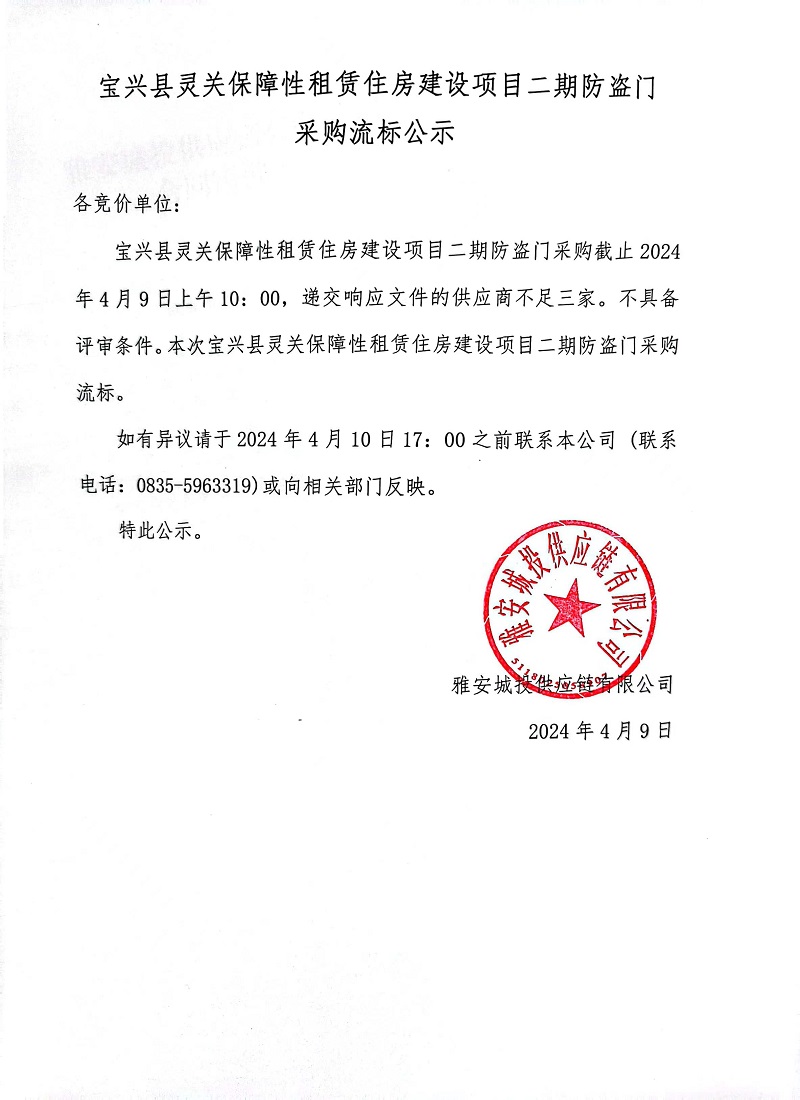 寶興縣靈關保障性租賃住房建設項目二期防盜門采購流標公示
