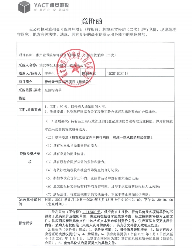 雅州壹號院總坪項(xiàng)目(樣板段)機(jī)械租賃采購(二次)競價(jià)公告