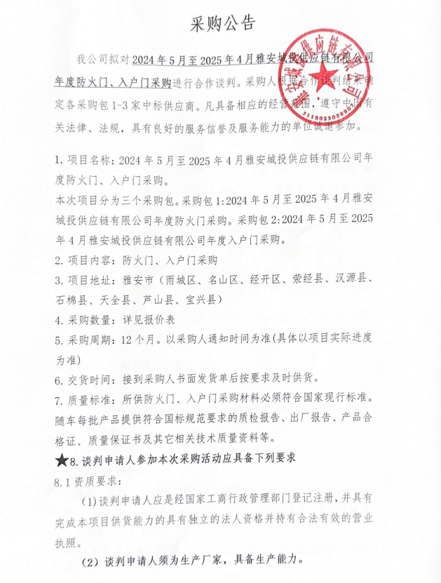 2024年5月至2025年4月雅安城投供應(yīng)鏈有限公司年度防火門(mén)、入戶門(mén)采購(gòu)公告