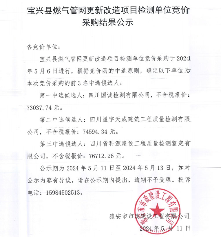寶興縣燃?xì)夤芫W(wǎng)更新改造項(xiàng)目檢測(cè)單位競(jìng)采購結(jié)果公示