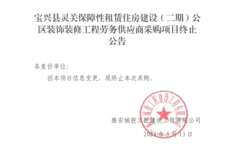 寶興縣靈關(guān)保障性租賃住房建設(shè)(二期)公區(qū)裝飾裝修工程勞務(wù)供應(yīng)商采購項目終止公告