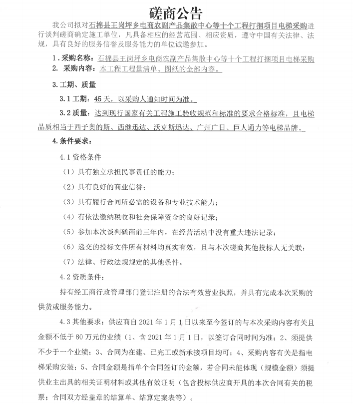 石棉縣王崗坪鄉(xiāng)電商農(nóng)副產(chǎn)品集散中心等十個(gè)工程打捆項(xiàng)目電梯采購(gòu)磋商公告