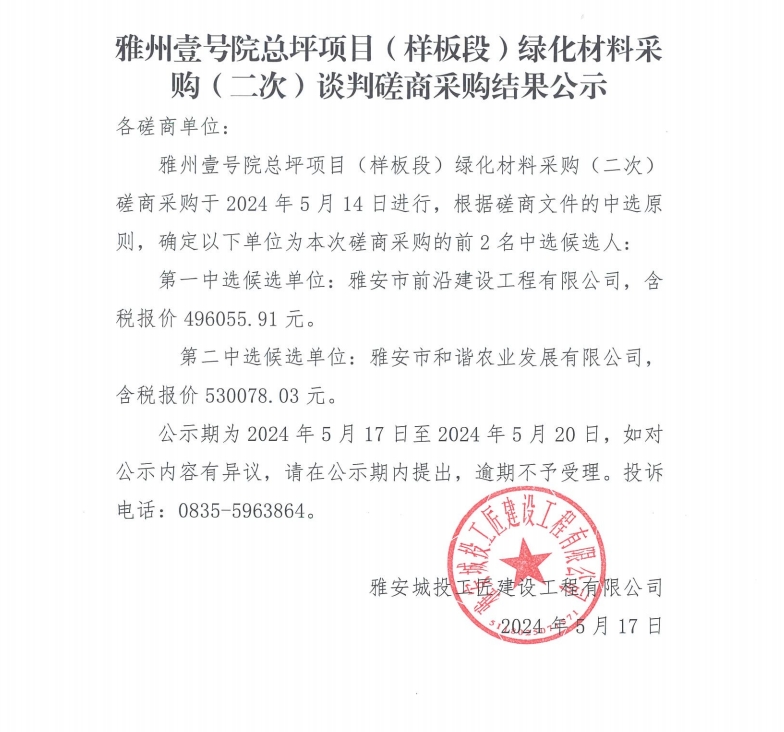 雅州壹號院總坪項目(樣板段)綠化材料采購 (二次)談判磋商采購結(jié)果公示
