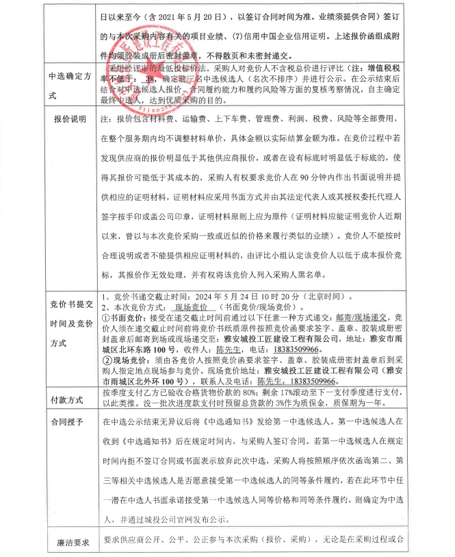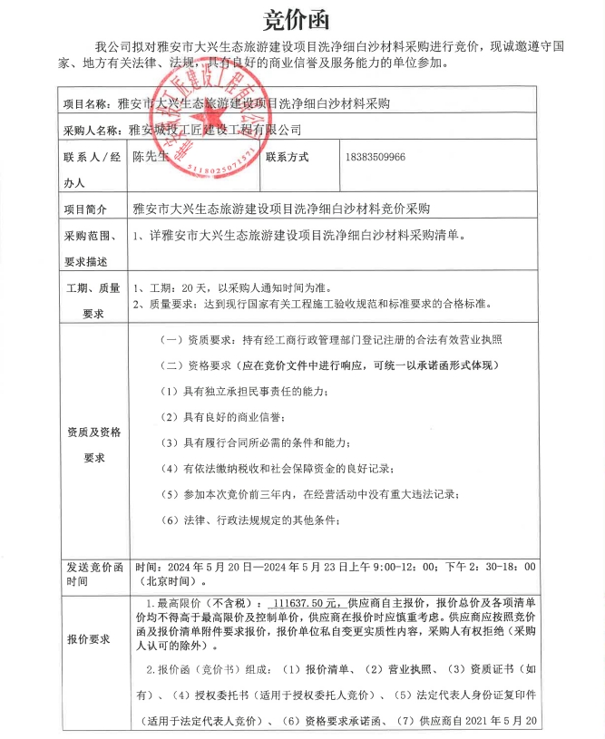 雅安市大興生態(tài)旅游建設項目洗凈細白沙材料采購競價公告