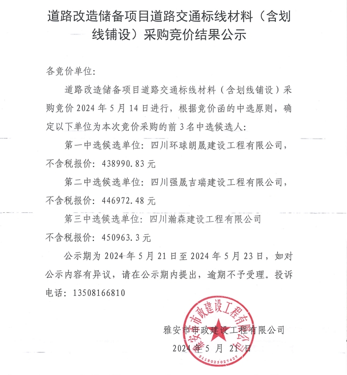 道路改造儲備項(xiàng)目道路交通標(biāo)線材料(含劃線鋪設(shè))采購競價(jià)結(jié)果公示