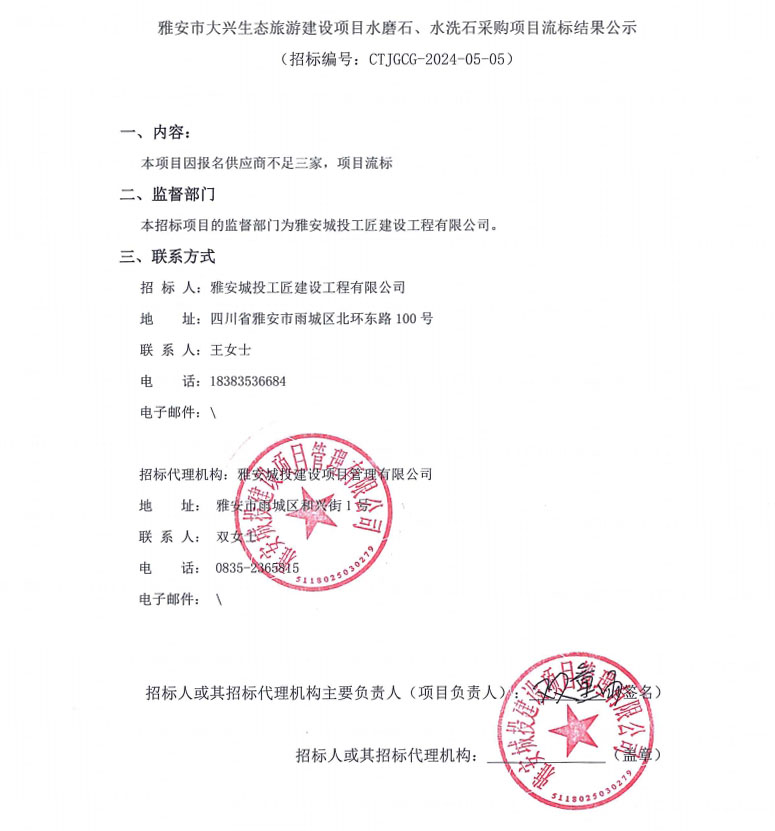 雅安市大興生態(tài)旅游建設(shè)項目水磨石、水洗石采購項目流標(biāo)結(jié)果公示
