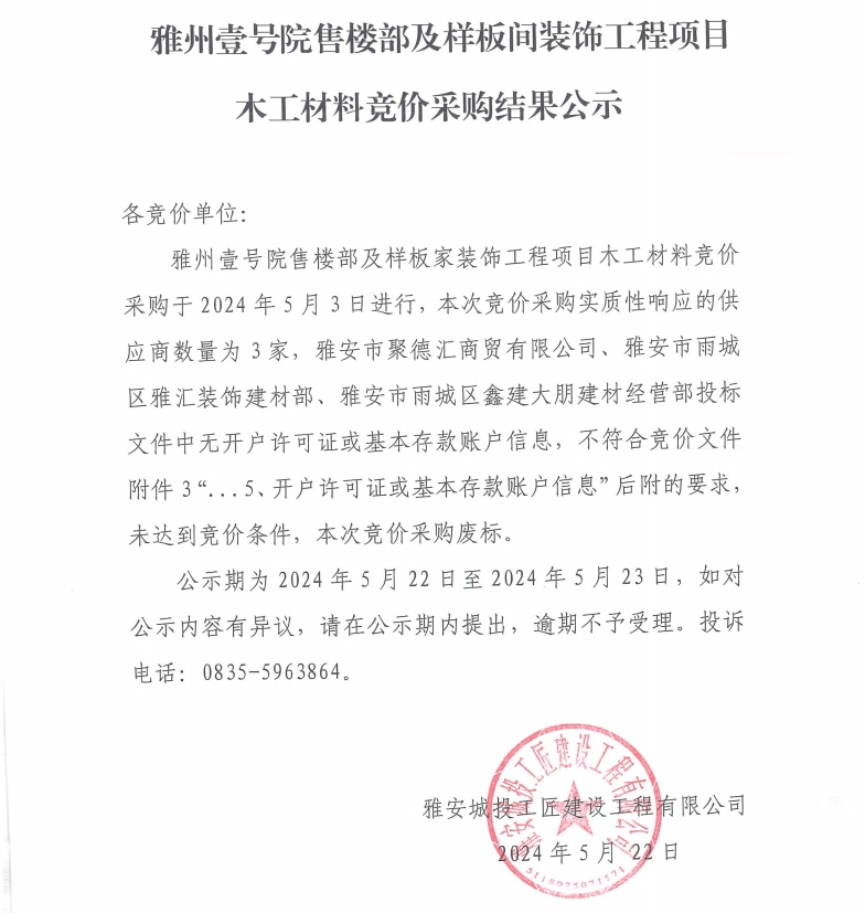 雅州壹號院售樓部及樣板間裝飾工程項目木工材料競價采購結果公示