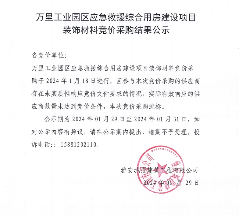 萬(wàn)里工業(yè)園區(qū)應(yīng)急救援綜合用房建設(shè)項(xiàng)目裝飾材料競(jìng)價(jià)采購(gòu)結(jié)果公示
