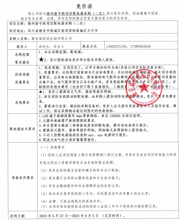 雅州壹號(hào)院項(xiàng)目配電箱采購(二次)競價(jià)公告