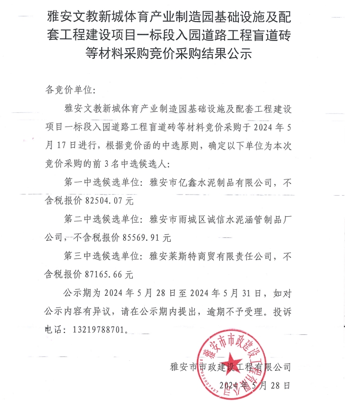 雅安文教新城體育產(chǎn)業(yè)制造園基礎(chǔ)設(shè)施及配套工程建設(shè)項目一標(biāo)段入園道路工程盲道磚等材料采購競價采購結(jié)果公示