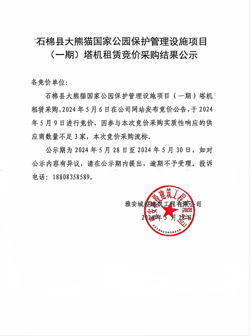 石棉縣大熊貓國家公園保護管理設(shè)施項目(一期)塔機租賃競價采購結(jié)果公示