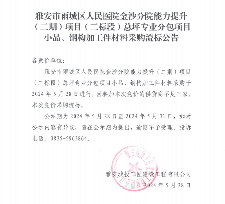 雅安市雨城區(qū)人民醫(yī)院金沙分院能力提升(二期)項目(二標段)總坪專業(yè)分包項目小品、鋼構加工件材料采購流標公告