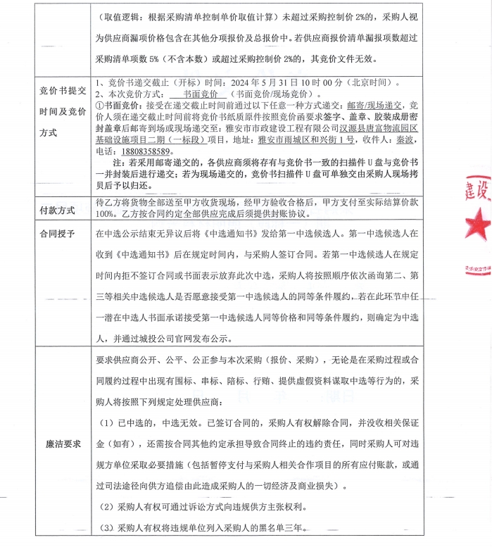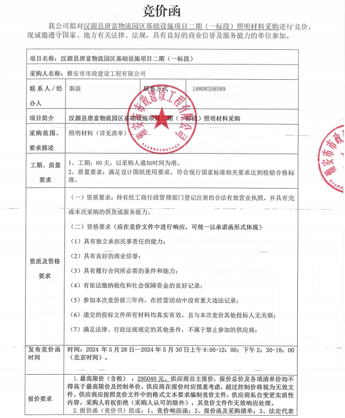 漢源縣唐富物流園區(qū)基礎(chǔ)設(shè)施項(xiàng)目二期(一標(biāo)段)照明材料采購(gòu)競(jìng)價(jià)公告