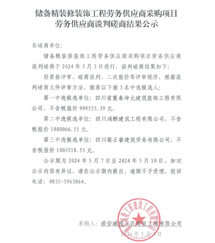 儲(chǔ)備精裝修裝飾工程勞務(wù)供應(yīng)商采購(gòu)項(xiàng)目勞務(wù)供應(yīng)商談判磋商結(jié)果公示