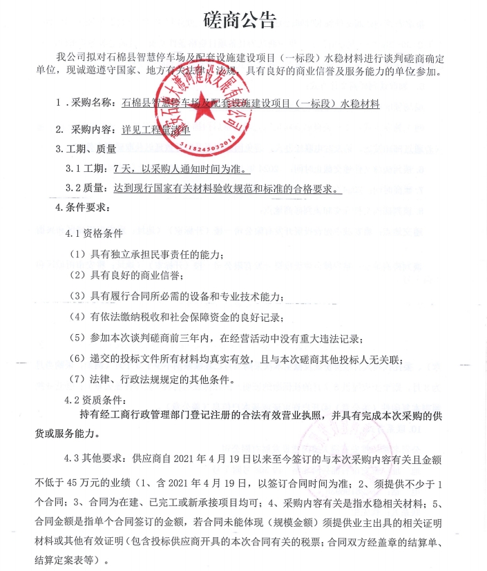 石棉縣智慧停車場及配套設(shè)施建設(shè)項目(一標(biāo)段)水穩(wěn)材料采購談判磋商公告