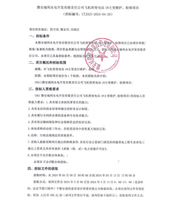 雅安城利水電開發(fā)有限責(zé)任公司飛機(jī)壩變電站1#主變維護(hù)、檢修項目公告