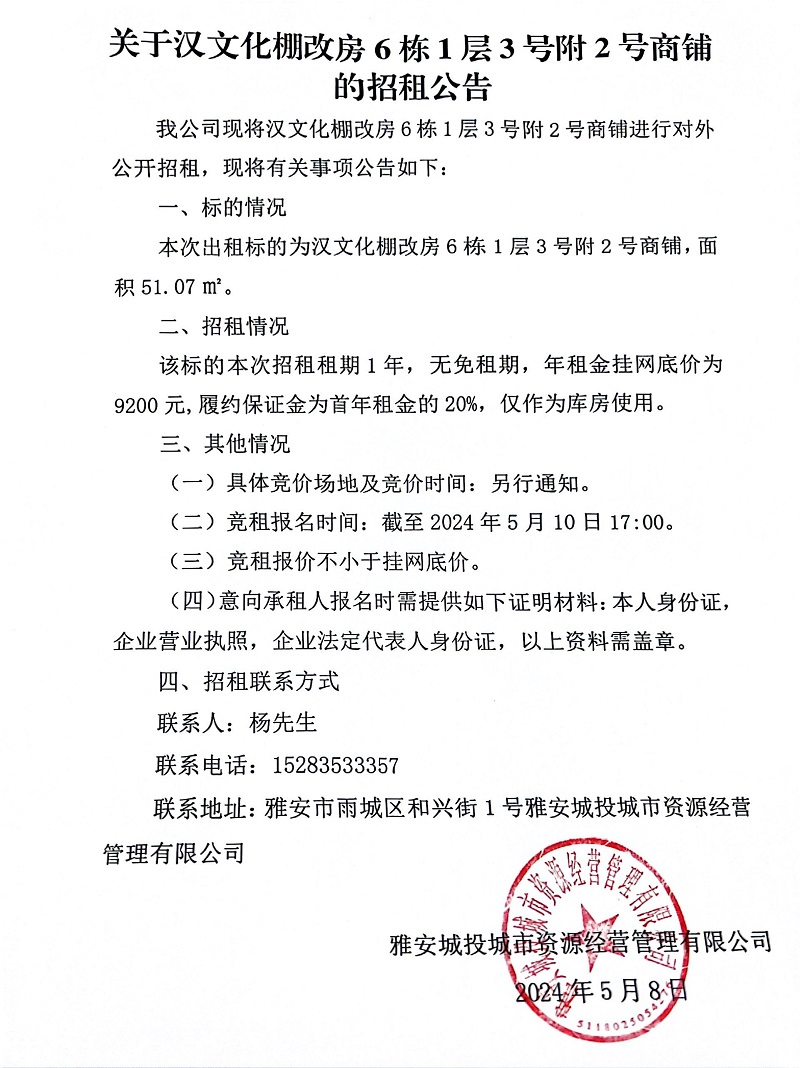 關(guān)于漢文化棚改房6棟1層3號附2號商鋪的招租公告