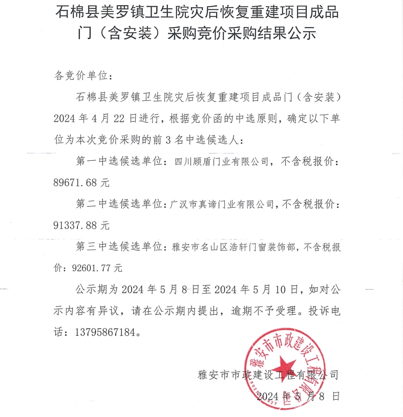 石棉縣美羅鎮(zhèn)衛(wèi)生院災(zāi)后恢復(fù)重建項(xiàng)目成品門(mén)(含安裝)采購(gòu)競(jìng)價(jià)采購(gòu)結(jié)果公示