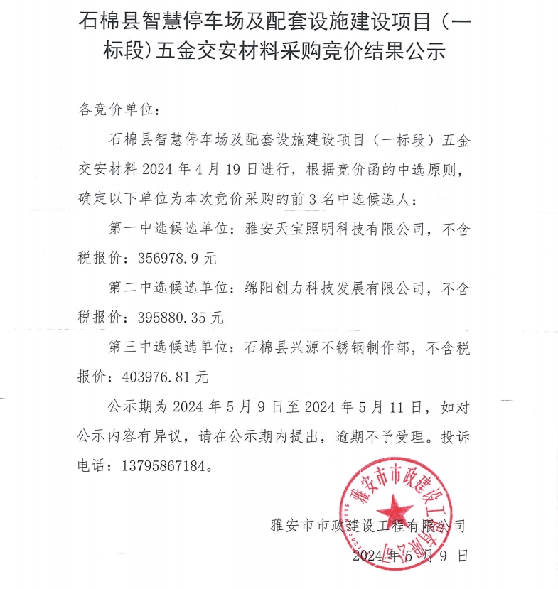 石棉縣智慧停車場及配套設施建設項目(一標段)五金交安材料采購競價結果公示