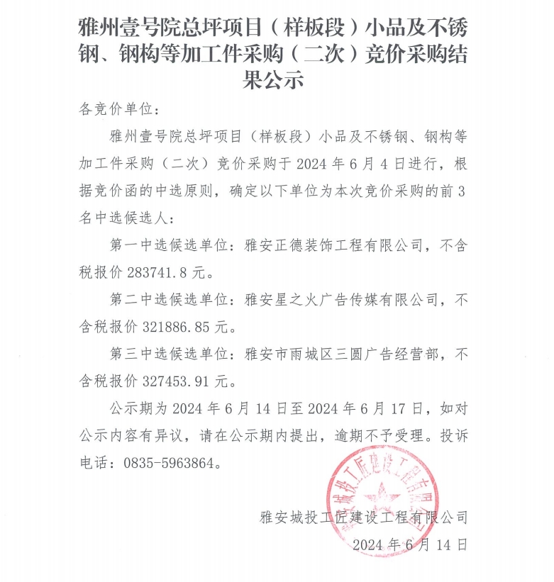 雅州壹號院總坪項目(樣板段)小品及不銹鋼、鋼構(gòu)等加工件采購(二次)競價采購結(jié)果公示